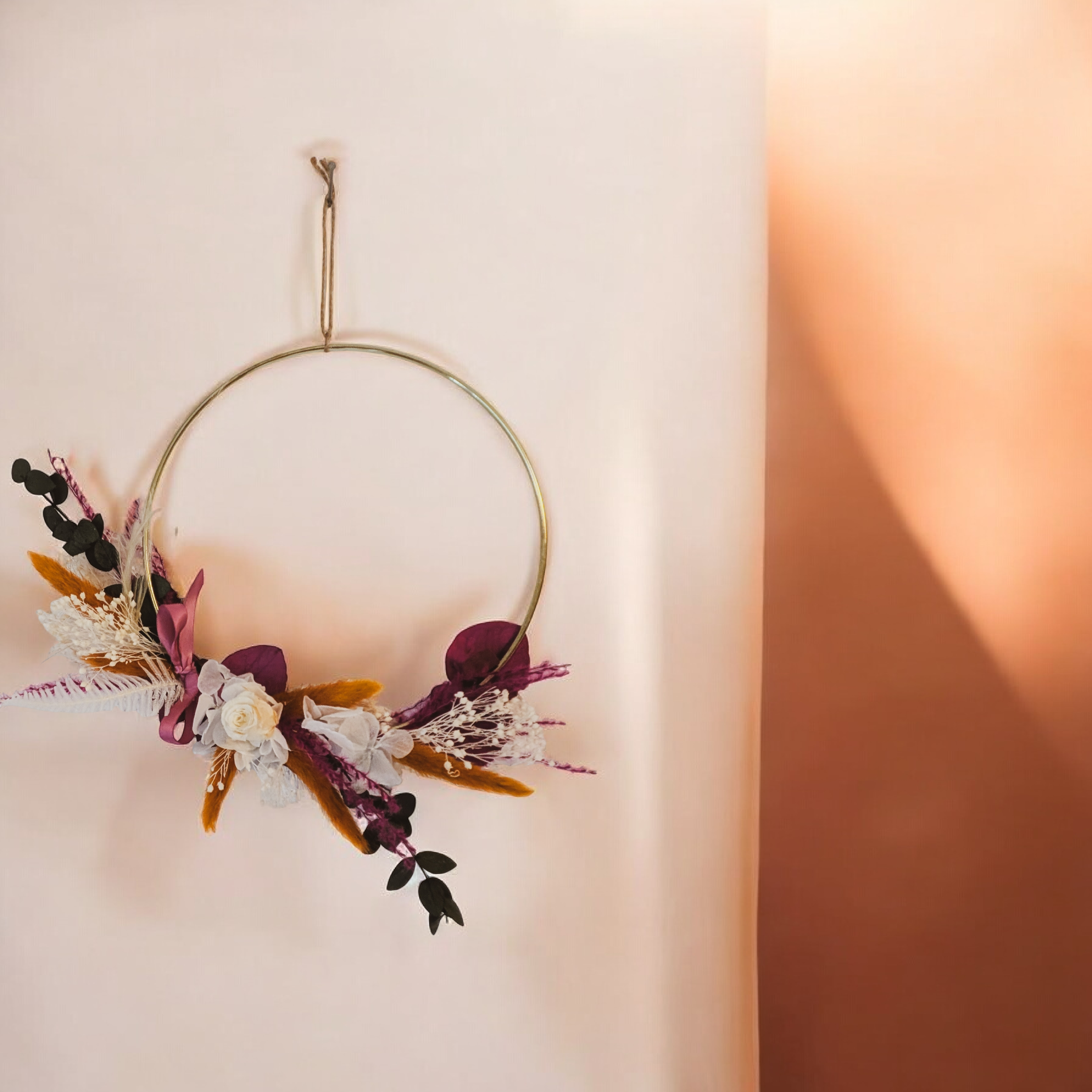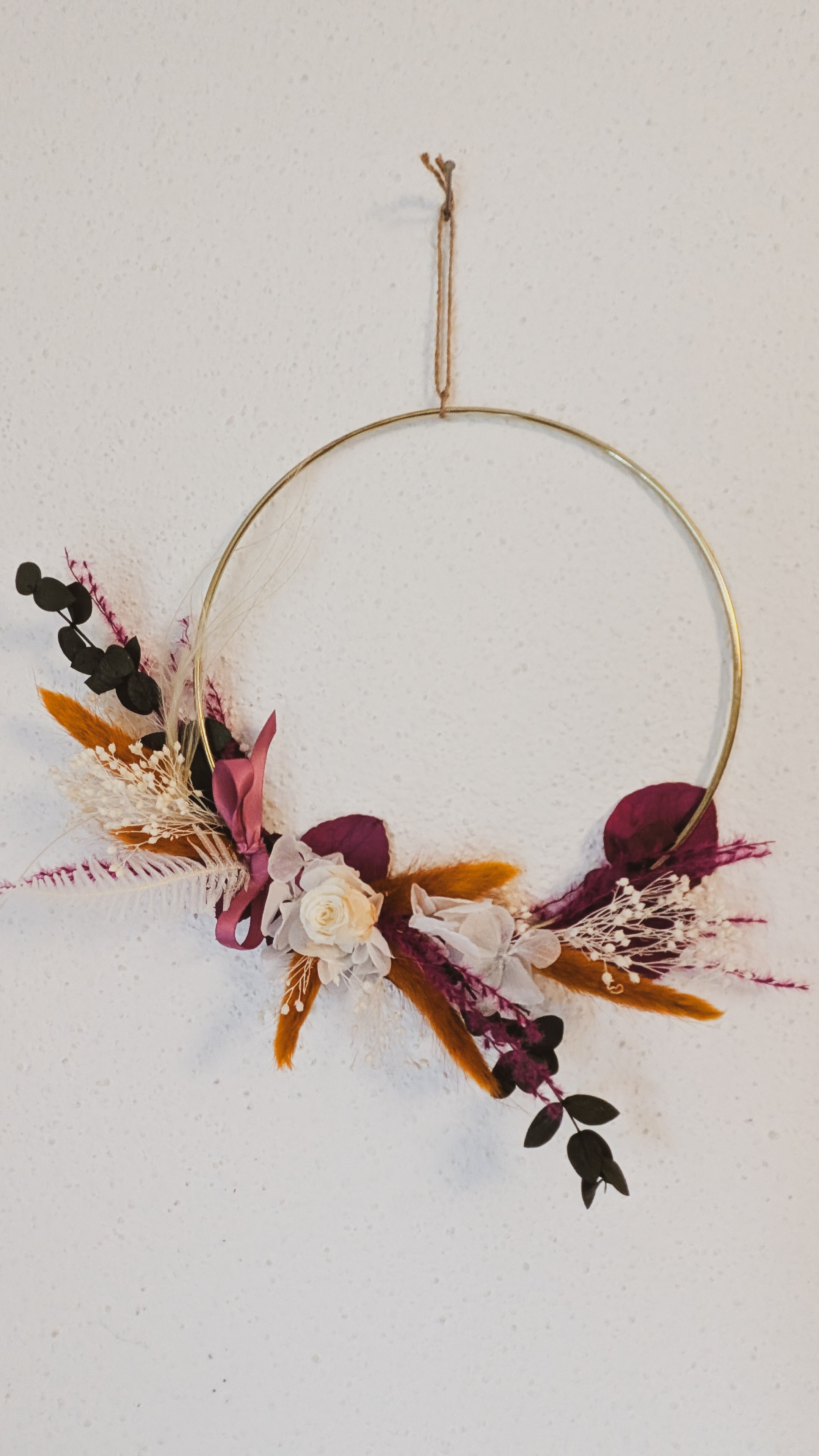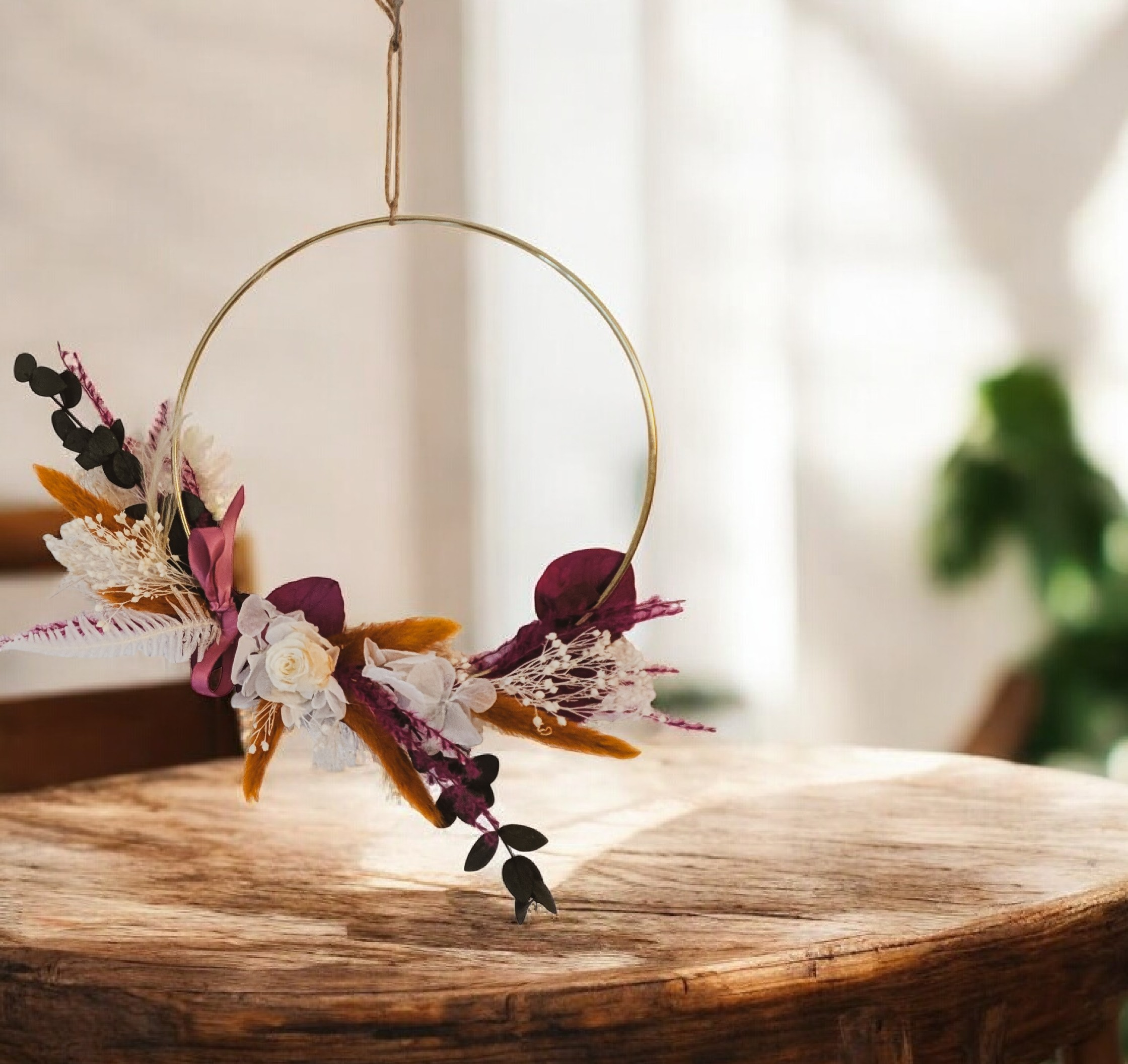 Cette couronne murale délicate est réalisée à la main à partir de fleurs séchées et sublimée par une rose immortelle ivoire, pour une décoration élégante et durable. Les tons chaleureux mêlant bordeaux, beige et touches naturelles apportent une atmosphère douce et raffinée à votre intérieur.