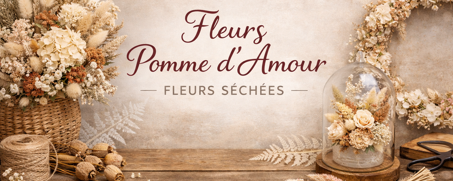Bienvenue chez Fleurs pomme d'Amour, atelier de fleuriste spécialisé exclusivement dans les fleurs séchées et stabilisées.